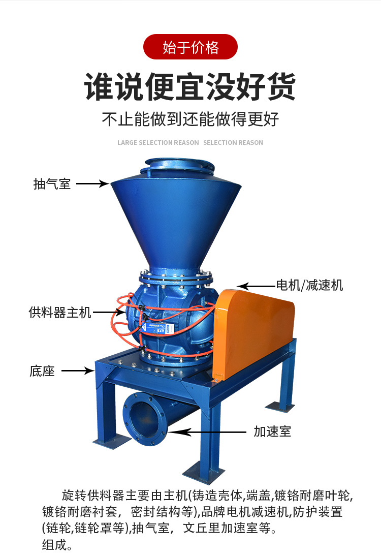 在壓送式,吸送式氣力輸送系統(tǒng)中是重要的組成部件之一,它可以均勻而連續(xù)的向熟料管內(nèi)供料,而在系統(tǒng)的分離,收塵部,它又具備卸料器,鎖氣器的功能。
